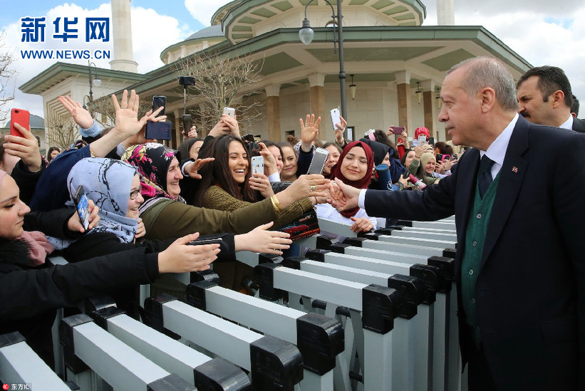當(dāng)?shù)貢r(shí)間3月30日,土耳其安卡拉,土耳其總統(tǒng)埃爾多安在星期五禮拜結(jié)束后與民眾打招呼。(圖片來(lái)源:東方IC)