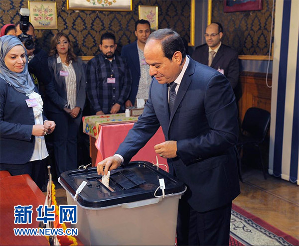 這張資料照片顯示的是,3月26日,塞西在埃及首都開(kāi)羅一個(gè)投票站參加總統(tǒng)選舉投票。新華社/中東社