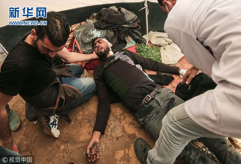 4月1日,加沙汗尤尼斯,在加沙地帶邊境沖突中受傷的巴勒斯坦人被送醫(yī)治療。巴勒斯坦人與以色列士兵30日在加沙地帶邊境爆發(fā)沖突,導(dǎo)致16名巴勒斯坦人死亡、上千人受傷。這天成為2014年巴以沖突后死傷最慘重的一天。(圖片來源:視覺中國)