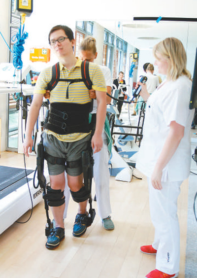 民眾在德國(guó)體驗(yàn)背負(fù)式康復(fù)機(jī)器。記者 管克江 攝
