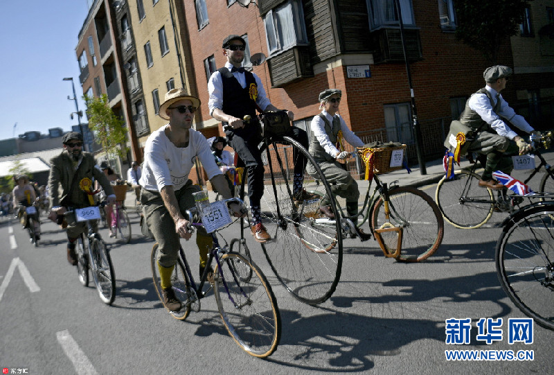 當?shù)貢r間2018年5月5日,英國倫敦,當?shù)嘏e辦復古騎行活動,民眾身穿花呢子服裝騎車穿行在倫敦街頭。今年是該活動舉辦十周年。(圖片來源:東方IC)