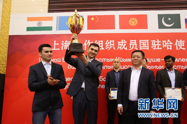 ? 中國駐哈薩克斯坦大使張漢暉(前排右一)為冠軍獲得者塔吉克斯坦隊(duì)頒發(fā)獎杯。 新華網(wǎng)發(fā) 阿比洛夫攝