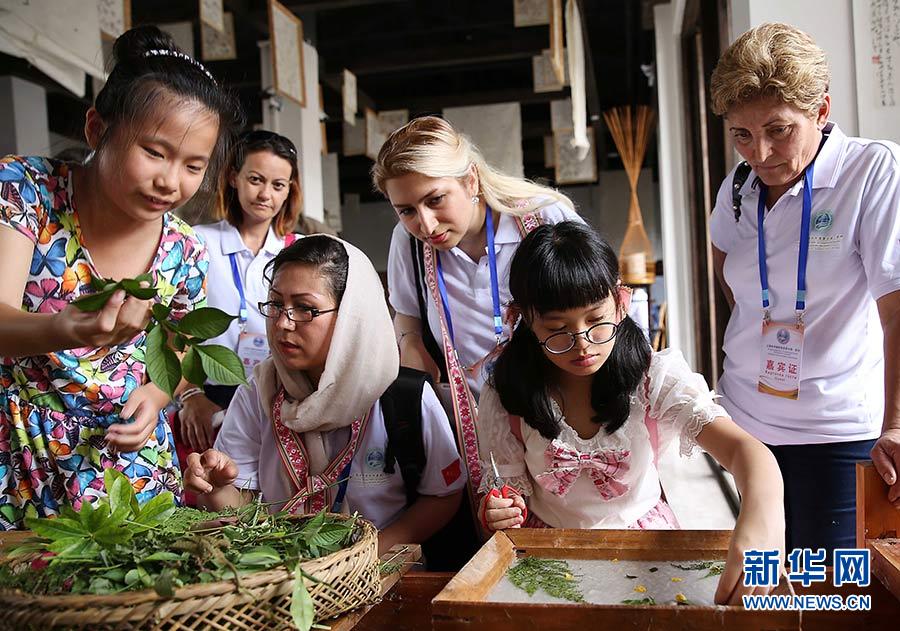 2017年8月15日,“魅力非遺——第二屆上海合作組織夏令營·非物質(zhì)文化遺產(chǎn)交流體驗(yàn)”活動(dòng)在貴州省黔東南苗族侗族自治州丹寨縣萬達(dá)小鎮(zhèn)舉行。這是外國手工藝人在古法造紙?bào)w驗(yàn)館了解花草紙的制作過程。新華社發(fā)(黃曉海 攝)