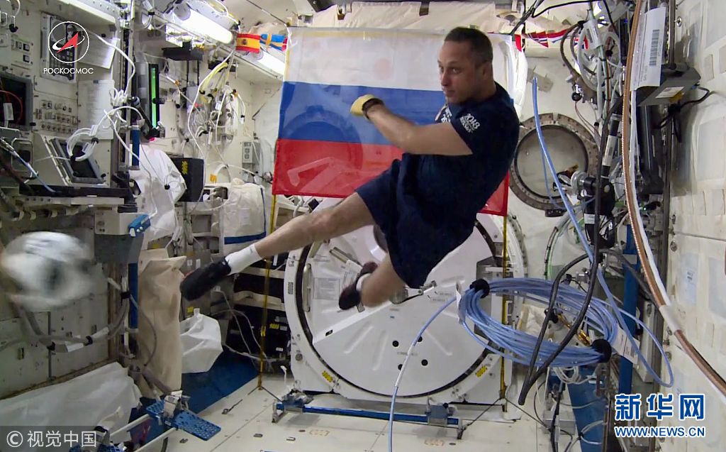 2018年5月31日,太空,俄羅斯宇航員Oleg Artemyev和自己的同事Anton Shkaplerov正在國(guó)際空間站內(nèi)玩足球,以此迎接俄羅斯世界杯的到來。(圖片來源:視覺中國(guó))