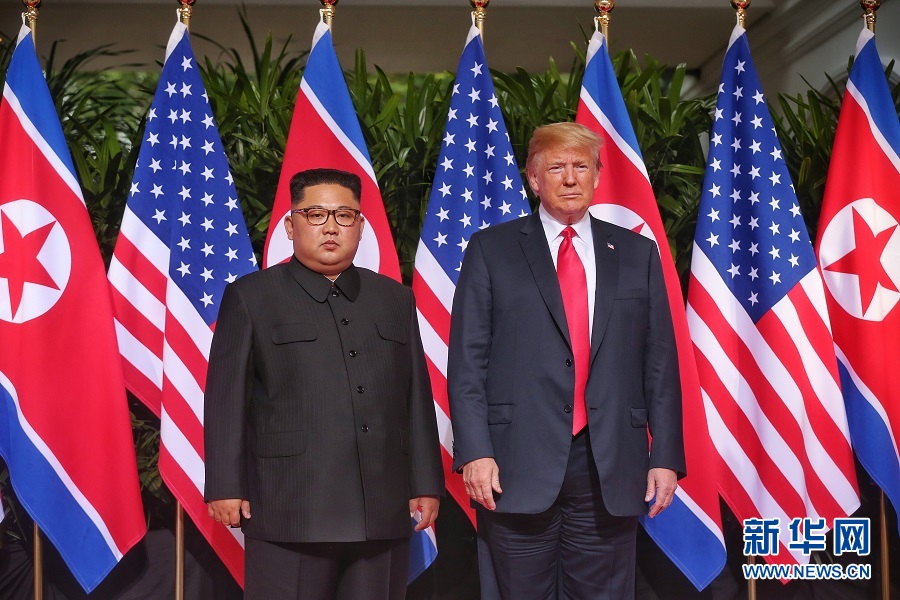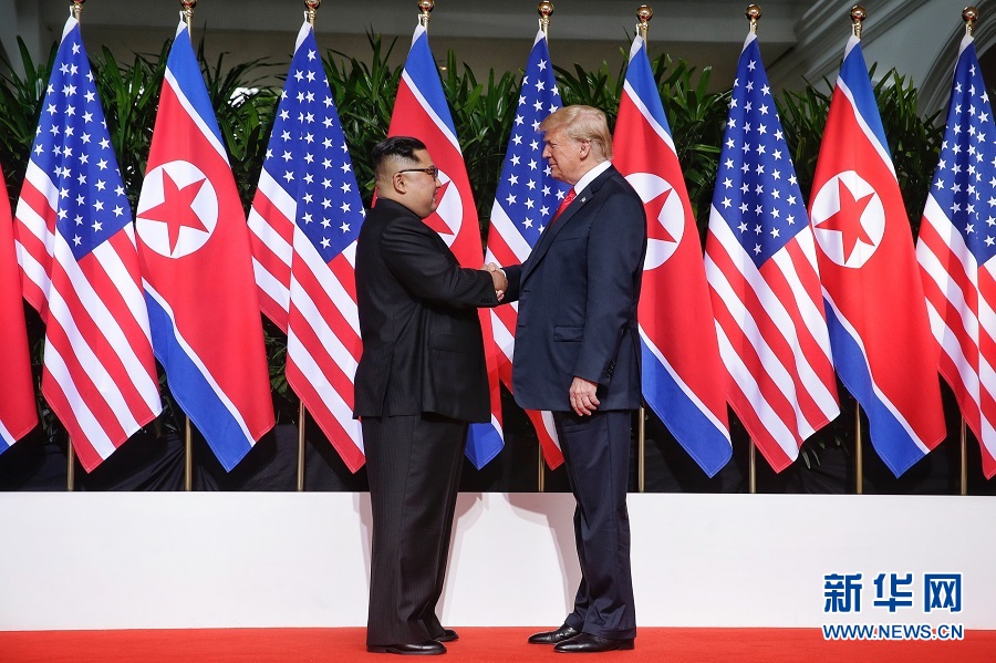 6月12日,朝鮮最高領(lǐng)導(dǎo)人金正恩(左)與美國總統(tǒng)特朗普在新加坡舉行會晤。 新華社發(fā)(新加坡海峽時(shí)報(bào)供圖)