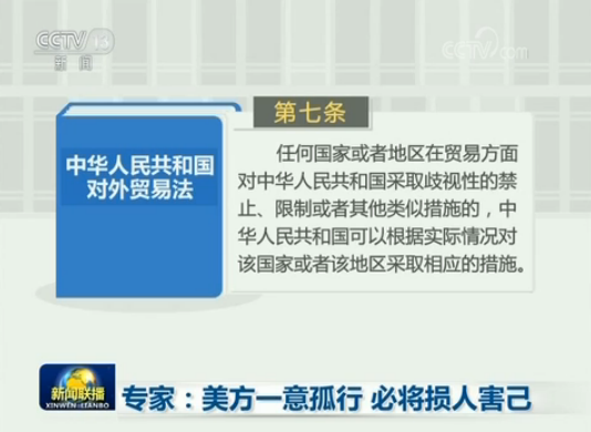 專家表示,中方采取的反制措施合理合法。根據(jù)《中華人民共和國對外貿(mào)易法》第七條,任何國家或者地區(qū)在貿(mào)易方面對中華人民共和國采取歧視性的禁止、限制或者其他類似措施的,中華人民共和國可以根據(jù)實(shí)際情況對該國家或者該地區(qū)采取相應(yīng)的措施。