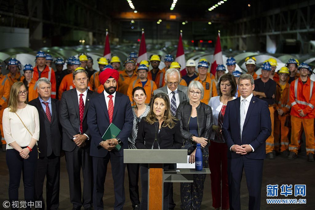 當(dāng)?shù)貢r(shí)間2018年6月29日,加拿大漢密爾頓,加拿大外交部長(zhǎng)弗里蘭、經(jīng)濟(jì)發(fā)展部長(zhǎng)貝恩斯和勞工部長(zhǎng)哈伊杜造訪斯特爾科鋼鐵公司,并共同宣布從7月1日起,加拿大將對(duì)約126億美元從美國(guó)進(jìn)口的商品加征關(guān)稅,以報(bào)復(fù)特朗普政府對(duì)加拿大鋼鋁產(chǎn)品加征關(guān)稅。他們還表示,加拿大政府將向本國(guó)鋼鋁產(chǎn)業(yè)和制造業(yè)提供約15億美元財(cái)政援助。(圖片來(lái)源:視覺(jué)中國(guó))