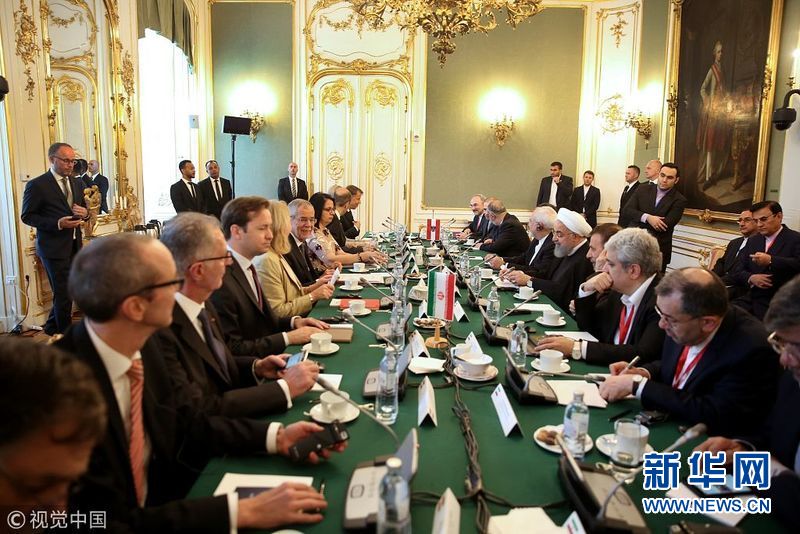 2018年7月4日,奧地利維也納,伊朗總統(tǒng)魯哈尼抵達(dá)奧地利進(jìn)行訪問,會晤奧地利總統(tǒng)范德貝倫和總理塞巴斯蒂安·庫爾茨。伊朗總統(tǒng)魯哈尼2日出發(fā)前往瑞士和奧地利訪問。他這次西歐行將重點討論伊朗核問題全面協(xié)議。(圖片來源:視覺中國)