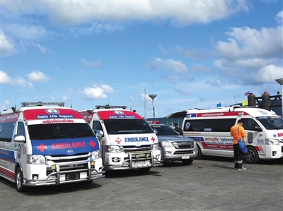 目前,普吉島查龍碼頭是搜救展開作業(yè)的地方,設(shè)有營救指揮部,內(nèi)部配有醫(yī)護(hù)人員、旅游警察以及軍方人員,外面還有5輛救護(hù)車待命。當(dāng)天普吉島天氣晴好,站在碼頭可看到大皇帝島,乘快艇二十分鐘便可抵達(dá)事發(fā)地附近。