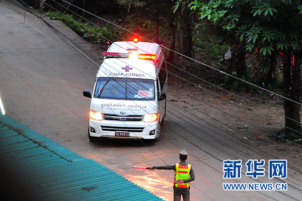 這是7月8日在泰國清萊拍攝的運送被解救出的少年足球隊員的救護(hù)車。新華社發(fā)(拉亨 攝)