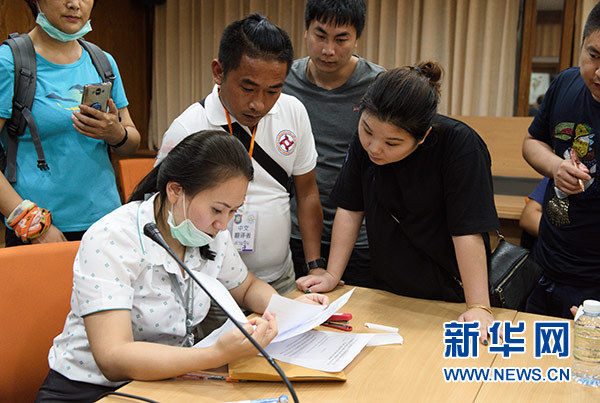 7月9日,在泰國普吉島的哇集拉醫(yī)院,來自蘇梅島的旅游警察志愿者(右)幫助遇難者家屬做確認(rèn)遺體登記工作。新華社記者 秦晴 攝