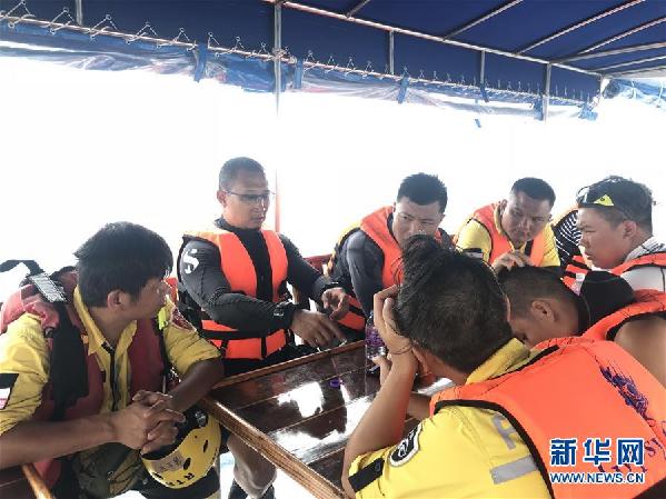 7月8日,在泰國普吉,來自民間的公羊救援隊(duì)與普吉藍(lán)海救援隊(duì)成員制定救援方案。新華社發(fā)(普吉藍(lán)海救援隊(duì)提供)