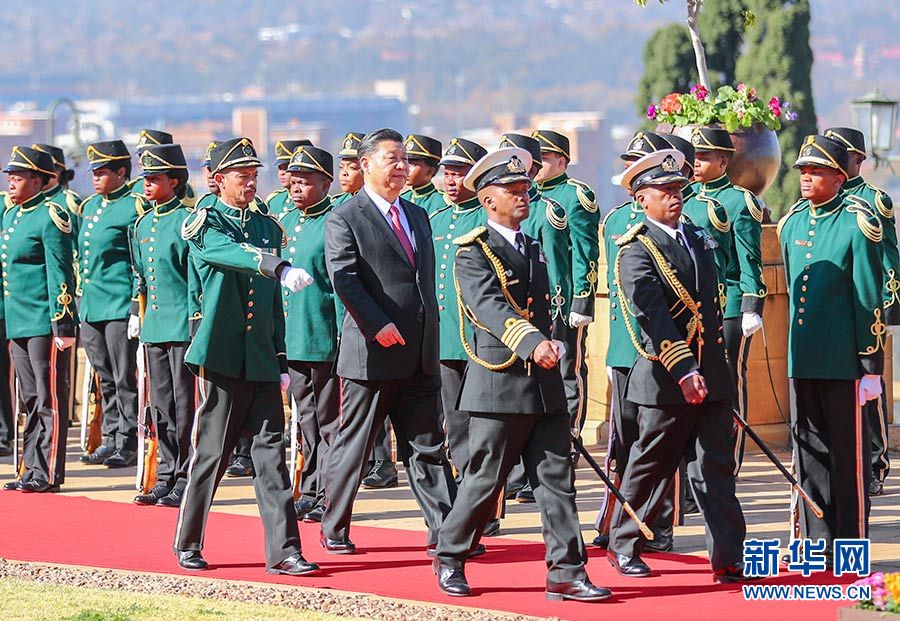 總統(tǒng)府前廣場(chǎng),微風(fēng)拂面,陽(yáng)光和煦。中南兩國(guó)國(guó)旗迎風(fēng)飄揚(yáng)。習(xí)近平和夫人彭麗媛受到拉馬福薩和夫人莫采佩熱情迎接。兩國(guó)元首夫婦登上檢閱臺(tái)。儀仗隊(duì)行持槍禮。軍樂(lè)隊(duì)奏中國(guó)國(guó)歌?,F(xiàn)場(chǎng)鳴放21響禮炮。習(xí)近平檢閱儀仗隊(duì)。軍樂(lè)隊(duì)奏南非國(guó)歌。習(xí)近平和彭麗媛同南方主要官員握手。拉馬福薩夫婦同中方陪同人員握手。兩國(guó)元首夫婦親切寒暄。拉馬福薩對(duì)習(xí)近平在南中建交20周年之際訪問(wèn)南非并出席金磚國(guó)家領(lǐng)導(dǎo)人會(huì)晤表示熱烈歡迎。