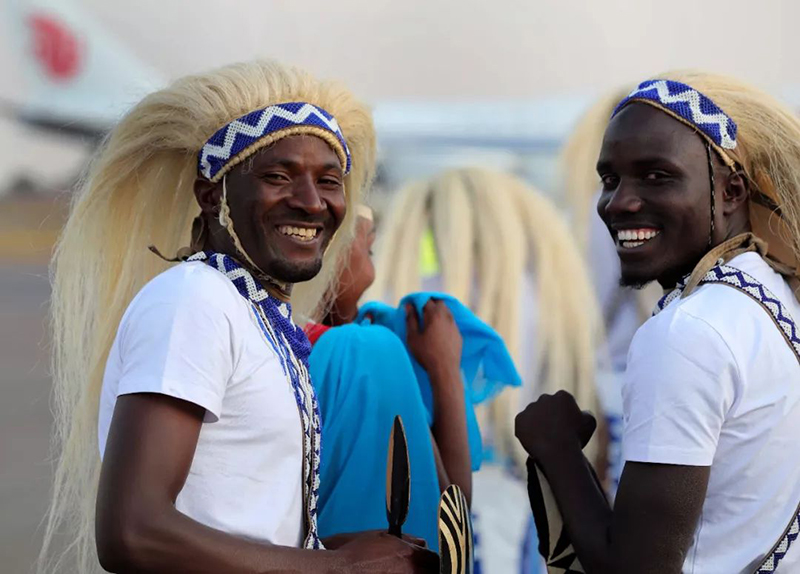 在機場舉行的歡送儀式上,身著民族服裝的盧旺達民眾。新華社記者 龐興雷攝