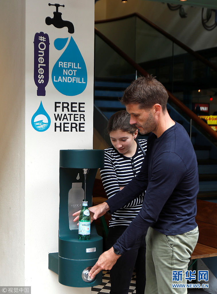 當(dāng)?shù)貢r間2018年8月28日,英國倫敦,民眾在公共飲水機旁飲水。倫敦市長近日引進(jìn)了20個新的公共飲水機,鼓勵人們自帶杯子取水喝,從而減少塑料垃圾。 (圖片來源:視覺中國)