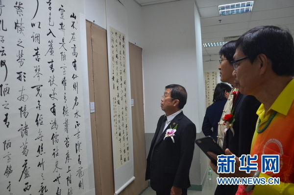 嘉賓欣賞參展書法作品。新華網發(fā)(王大瑋攝)