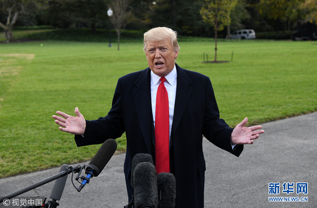 當(dāng)?shù)貢r間2018年10月31日,美國華盛頓,美國總統(tǒng)特朗普啟程前往佛羅里達(dá)州出席競選集會,在白宮南草坪發(fā)表講話。特朗普稱,計(jì)劃部署在美墨邊境的現(xiàn)役軍人數(shù)量或增加至15000人,以嚴(yán)防來勢洶洶的“大篷車”移民。(圖片來源:視覺中國)