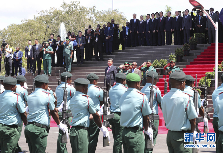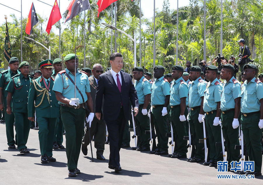 11月16日,國家主席習(xí)近平在莫爾茲比港會見巴布亞新幾內(nèi)亞總督達(dá)達(dá)埃。會見開始前,達(dá)達(dá)埃在議會大廈前廣場為習(xí)近平舉行隆重歡迎儀式。新華社記者 費(fèi)茂華 攝