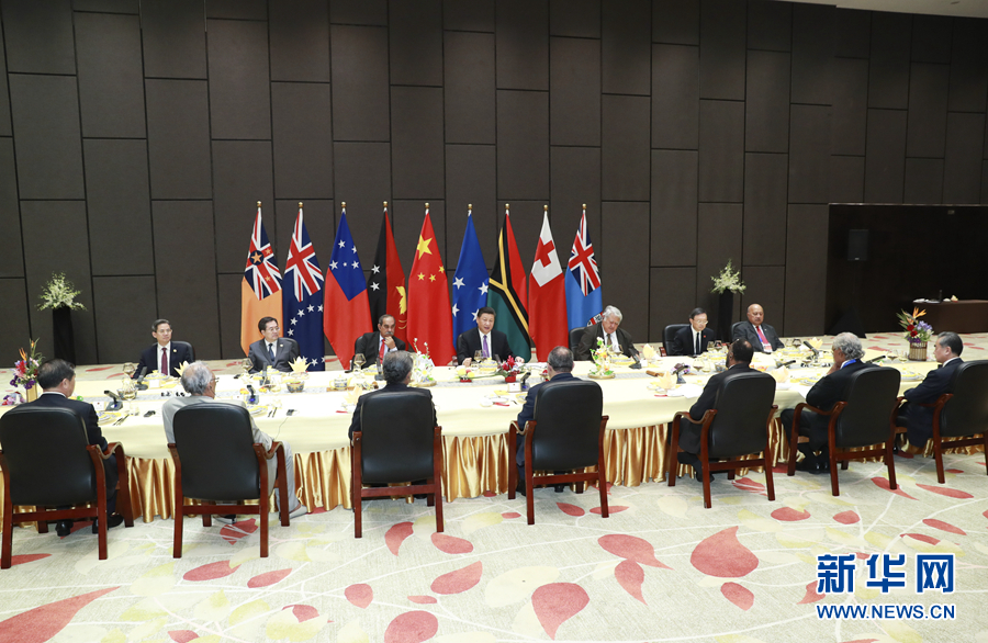 11月16日,國(guó)家主席習(xí)近平在莫爾茲比港同巴布亞新幾內(nèi)亞總理奧尼爾、密克羅尼西亞聯(lián)邦總統(tǒng)克里斯琴、薩摩亞總理圖伊拉埃帕、瓦努阿圖總理薩爾瓦伊、庫(kù)克群島總理普納、湯加首相波希瓦、紐埃總理塔拉吉等建交太平洋島國(guó)領(lǐng)導(dǎo)人以及斐濟(jì)政府代表、國(guó)防部長(zhǎng)昆布安博拉舉行集體會(huì)晤。習(xí)近平主持會(huì)晤并發(fā)表主旨講話。 新華社記者 謝環(huán)馳 攝