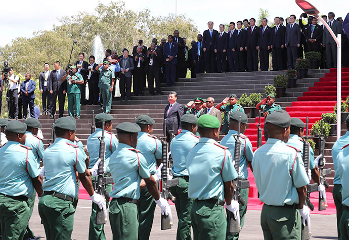 11月16日,國家主席習(xí)近平在莫爾茲比港會(huì)見巴布亞新幾內(nèi)亞總督達(dá)達(dá)埃。會(huì)見開始前,達(dá)達(dá)埃在議會(huì)大廈前廣場為習(xí)近平舉行隆重歡迎儀式。新華社記者 丁林 攝
