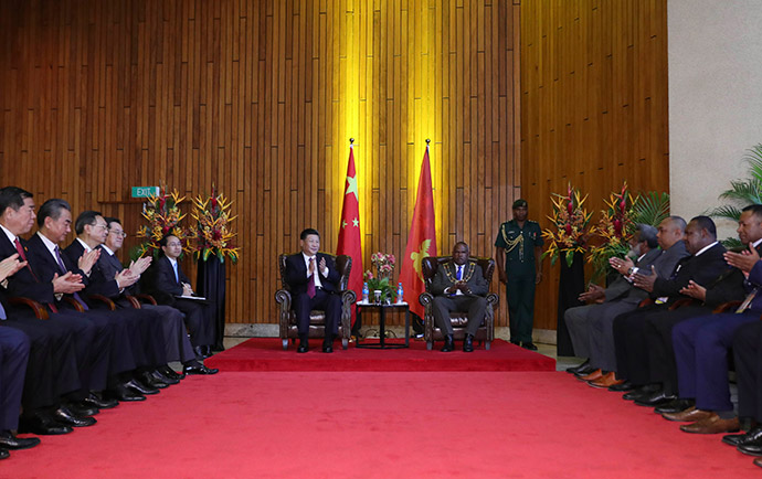 11月16日,國家主席習(xí)近平在莫爾茲比港分別會(huì)見建交太平洋島國領(lǐng)導(dǎo)人。這是習(xí)近平會(huì)見紐??偫硭P氯A社記者 丁林 攝