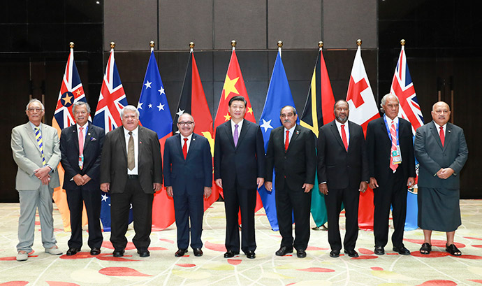 11月16日,國家主席習(xí)近平在莫爾茲比港同巴布亞新幾內(nèi)亞總理奧尼爾、密克羅尼西亞聯(lián)邦總統(tǒng)克里斯琴、薩摩亞總理圖伊拉埃帕、瓦努阿圖總理薩爾瓦伊、庫克群島總理普納、湯加首相波希瓦、紐埃總理塔拉吉等建交太平洋島國領(lǐng)導(dǎo)人以及斐濟(jì)政府代表、國防部長昆布安博拉舉行集體會(huì)晤。習(xí)近平主持會(huì)晤并發(fā)表主旨講話。新華社記者 龐興雷 攝