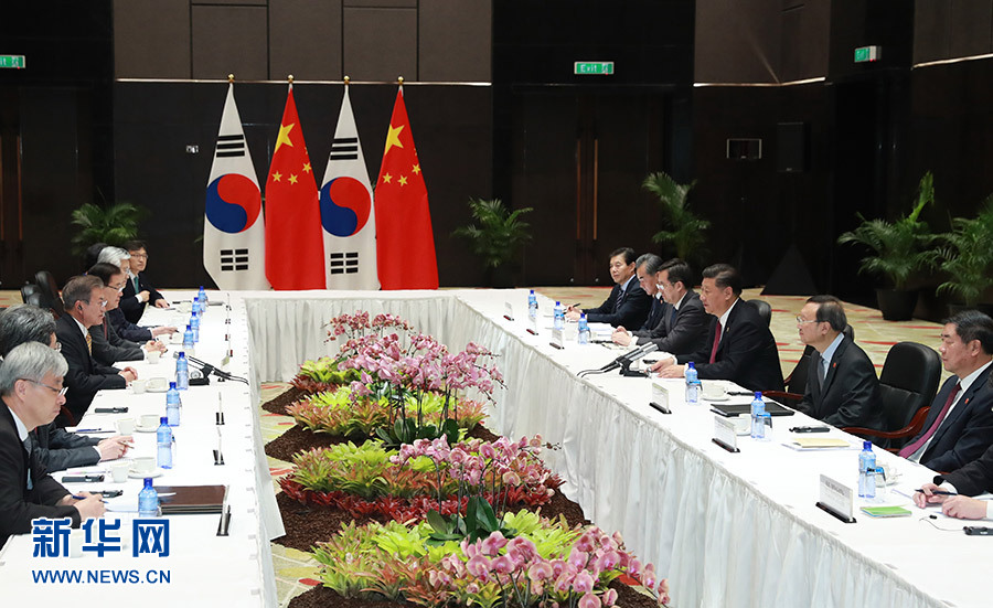 習近平指出,過去一年,我同總統(tǒng)先生達成的各項共識正得到有效落實,兩國關系穩(wěn)步改善和發(fā)展。我們要不斷深化中韓戰(zhàn)略合作伙伴關系,共同為促進地區(qū)持久和平和繁榮作出積極貢獻。雙方要繼續(xù)發(fā)揮好高層引領作用,尊重彼此核心利益和重大關切,加強溝通,建立和鞏固互信,繼續(xù)妥善處理好敏感問題。要重點推進共建“一帶一路”,加快兩國自由貿易協(xié)定第二階段談判,推動雙邊互利合作優(yōu)化升級。要加強在亞太經合組織、二十國集團、中日韓等多邊框架內協(xié)調和合作。