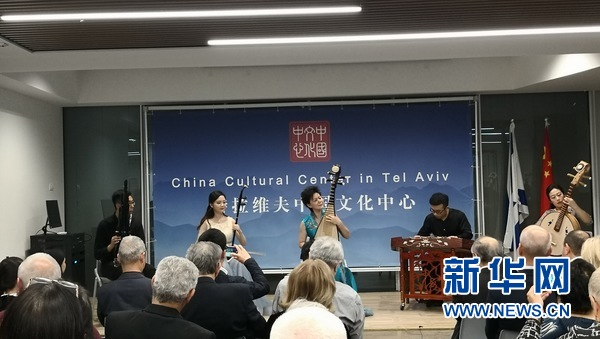 中央音樂(lè)學(xué)院教授、琵琶演奏家章紅艷和團(tuán)隊(duì)在特拉維夫中國(guó)文化中心慶祝成立一周年活動(dòng)上民樂(lè)合奏。新華社記者陳文仙攝