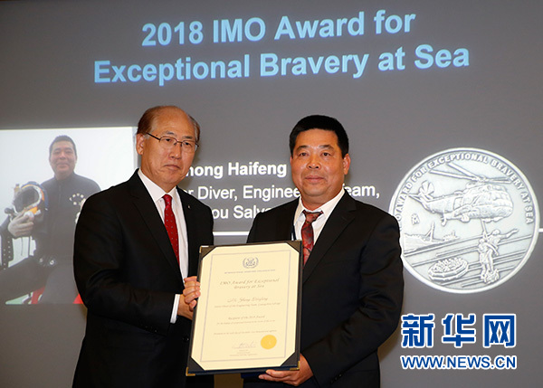 新華社倫敦12月7日電(記者梁希之)中國廣州打撈局高級潛水員鐘海鋒6日晚在倫敦獲得國際海事組織頒發(fā)的2018年度最高獎(jiǎng)項(xiàng)——“海上特別勇敢獎(jiǎng)”。