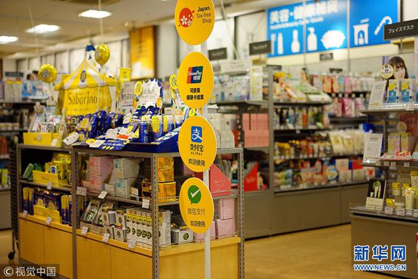 7月14日,日本大阪的某商場,幾乎每一個(gè)專柜前都立有中國移動支付的提示牌。(圖片來源:視覺中國)