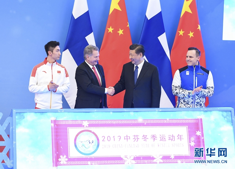 簽字儀式后,習(xí)近平同尼尼斯托共同出席了“2019中芬冬季運(yùn)動(dòng)年”啟動(dòng)儀式。習(xí)近平在致辭中指出,新中國第一次走上奧運(yùn)賽場就是參加1952年芬蘭赫爾辛基奧運(yùn)會,五星紅旗第一次在奧林匹克體育場上升起。中芬冬季運(yùn)動(dòng)發(fā)展契合度高、互補(bǔ)性強(qiáng),合作潛力巨大。相信“2019中芬冬季運(yùn)動(dòng)年”將推動(dòng)兩國體育合作邁上新臺階,共同為中芬人文交流注入新活力,不斷推動(dòng)中芬面向未來的新型合作伙伴關(guān)系邁上新臺階。尼尼斯托表示,中國已成為世界體育大國。芬中在體育領(lǐng)域結(jié)緣已久。芬蘭支持中國成功舉辦2022年冬奧會,很高興成為第一個(gè)同中國開啟冬季運(yùn)動(dòng)年的國家,相信這將進(jìn)一步促進(jìn)兩國人民的友誼。中國正在向冬季運(yùn)動(dòng)強(qiáng)國邁進(jìn),芬蘭愿助一臂之力。