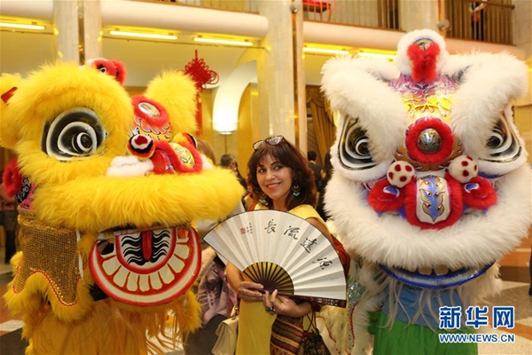 1月23日,在白俄羅斯首都明斯克,一位白俄羅斯姑娘在“歡樂(lè)春節(jié)”活動(dòng)上與舞獅者合影。新華社記者 魏忠杰 攝