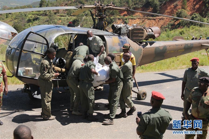 3月21日,在津巴布韋馬尼卡蘭省奇馬尼馬尼,一架軍方直升機(jī)轉(zhuǎn)運遇難者遺體。新華社發(fā)(肖恩·朱薩 攝)