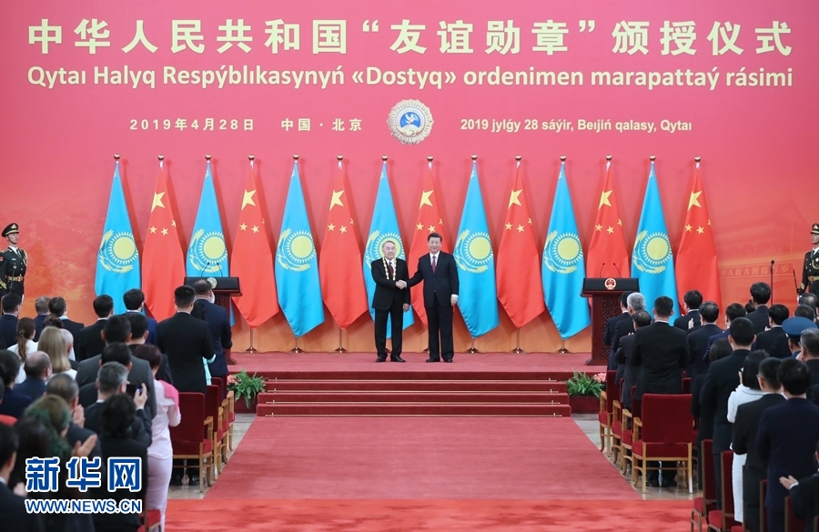 納扎爾巴耶夫致答辭。納扎爾巴耶夫表示,非常感謝習近平主席今天向我頒授中華人民共和國“友誼勛章”,這對我是無上榮譽。這枚勛章反映了中方對我致力于推進哈中全面戰(zhàn)略伙伴關系努力的高度認可。哈中在相互尊重和相互信任基礎上建立起的友好關系已經(jīng)成為國與國關系的典范,兩國間沒有任何未決問題。我同中國領導人之間的深厚友誼和互信將永遠留在我心里。我衷心祝賀中國成功舉辦第二屆“一帶一路”國際合作高峰論壇。習近平主席提出的“一帶一路”倡議,已經(jīng)成為成功的國際合作平臺,不僅推動了亞歐大陸的共同發(fā)展,也促進了世界的和平與繁榮。在中華人民共和國成立70周年之際,我衷心祝愿中國人民在以習近平同志為核心的中國共產(chǎn)黨領導下,順利實現(xiàn)中華民族偉大復興的中國夢。中國的發(fā)展繁榮對世界是重大利好。