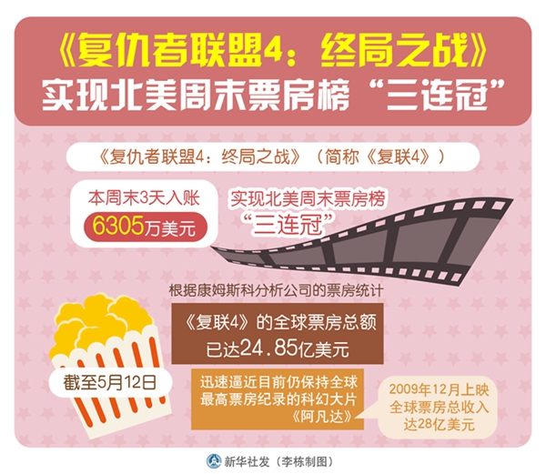 根據(jù)康姆斯科分析公司的票房統(tǒng)計(jì),截至5月12日,《復(fù)聯(lián)4》的全球票房總額已達(dá)24.85億美元,迅速逼近目前仍保持全球最高票房紀(jì)錄的科幻大片《阿凡達(dá)》。2009年12月上映的《阿凡達(dá)》由著名導(dǎo)演詹姆斯·卡梅隆執(zhí)導(dǎo),全球票房總收入達(dá)28億美元。