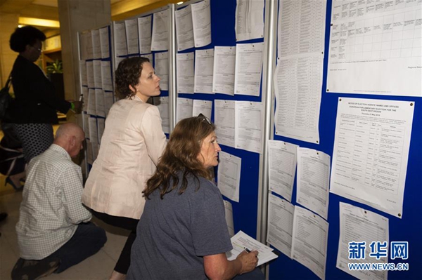 5月26日,在英國(guó)南安普敦的一個(gè)計(jì)票站,媒體和黨派成員查看投票結(jié)果。新華社發(fā)(雷伊·唐 攝)