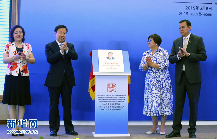 6月8日,在吉爾吉斯斯坦比什凱克,吉爾吉斯斯坦前總統(tǒng)奧通巴耶娃(右二)、吉爾吉斯斯坦議會(huì)副議長(zhǎng)巴基羅夫(右一)、中宣部常務(wù)副部長(zhǎng)王曉暉(左二)和中國(guó)駐吉爾吉斯斯坦大使杜德文(左一)共同為《習(xí)近平談治國(guó)理政》第一卷吉爾吉斯文版新書揭幕。 《習(xí)近平談治國(guó)理政》第一卷吉爾吉斯文版首發(fā)式暨中吉治國(guó)理政研討會(huì)6月8日在比什凱克總統(tǒng)官邸舉行。 新華社發(fā)(羅曼攝)