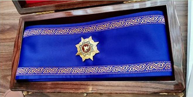 這就是授予習(xí)近平主席的勛章?!艾敿{斯”勛章是吉爾吉斯斯坦國家最高獎?wù)拢杉獱柤顾固箍偨y(tǒng)授予,分三個等級,一級為最高等級。新華社記者 丁林 攝