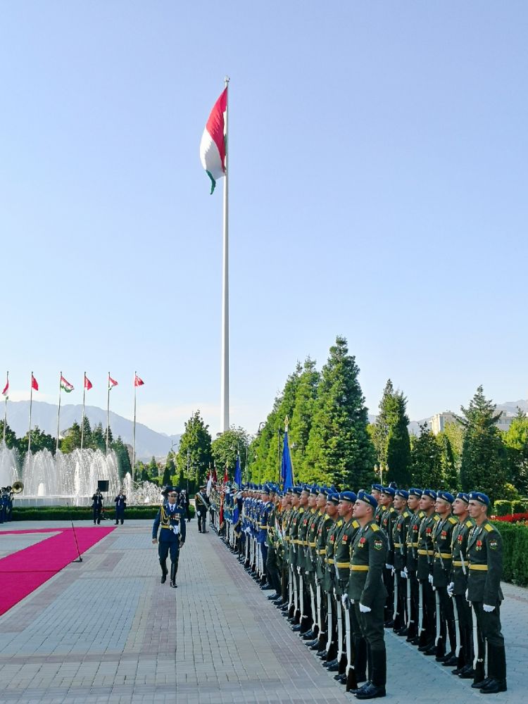 儀仗隊(duì)在塔吉克斯坦總統(tǒng)府列隊(duì),等候兩國(guó)元首檢閱。遠(yuǎn)處高聳的旗桿位于總統(tǒng)府外的國(guó)旗公園,高165米,是杜尚別的地標(biāo)建筑之一。新華社記者 霍小光 攝