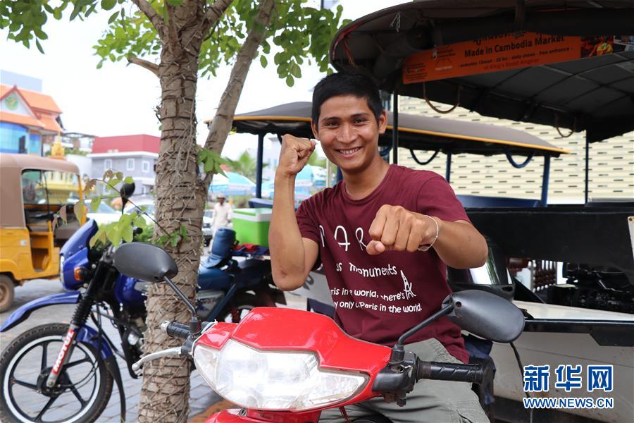 6月11日,在柬埔寨暹粒,孫塞貼農(nóng)騎在嘟嘟車上對鏡頭做出武術(shù)動(dòng)作。新華社記者 毛鵬飛 攝