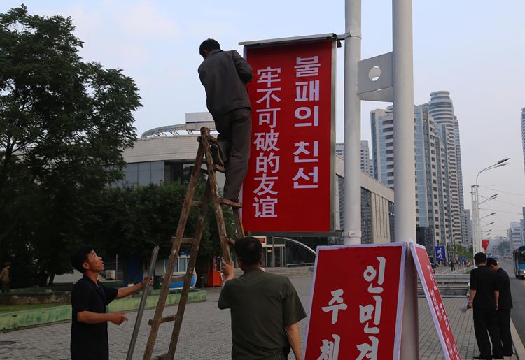 6月19日,工作人員在平壤街頭懸掛使用中朝雙語(yǔ)書寫的“牢不可破的友誼”標(biāo)語(yǔ)牌。新華社記者江亞平攝