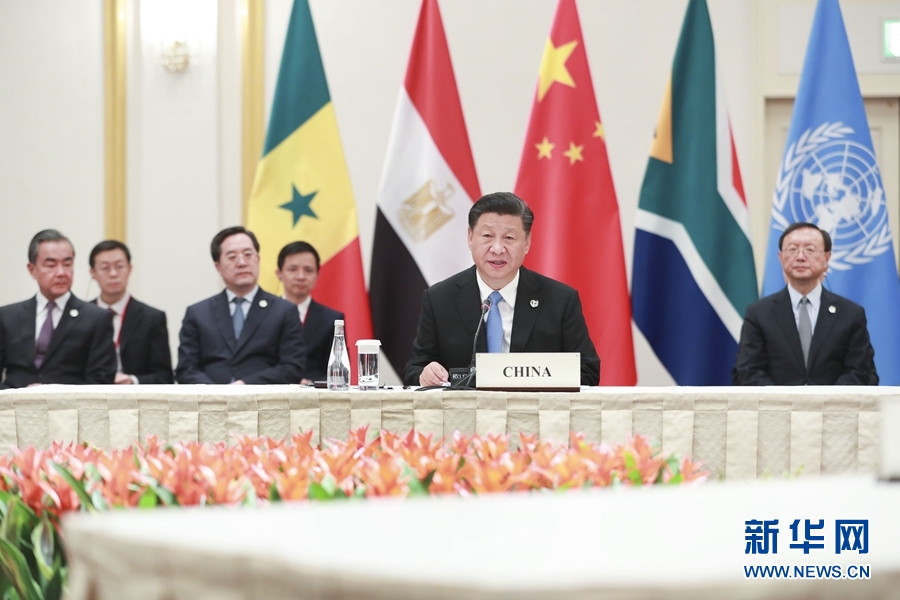 6月28日,國家主席習近平在大阪主持中非領導人會晤。中非合作論壇前任非方共同主席國南非總統(tǒng)拉馬福薩、非洲聯(lián)盟輪值主席國埃及總統(tǒng)塞西、中非合作論壇現(xiàn)任非方共同主席國塞內加爾總統(tǒng)薩勒和聯(lián)合國秘書長古特雷斯出席。 新華社記者 龐興雷 攝