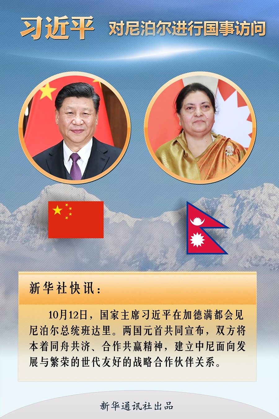 新華社加德滿都10月12日電 10月12日,國(guó)家主席習(xí)近平在加德滿都會(huì)見(jiàn)尼泊爾總統(tǒng)班達(dá)里。兩國(guó)元首共同宣布,雙方將本著同舟共濟(jì)、合作共贏精神,建立中尼面向發(fā)展與繁榮的世代友好的戰(zhàn)略合作伙伴關(guān)系。
