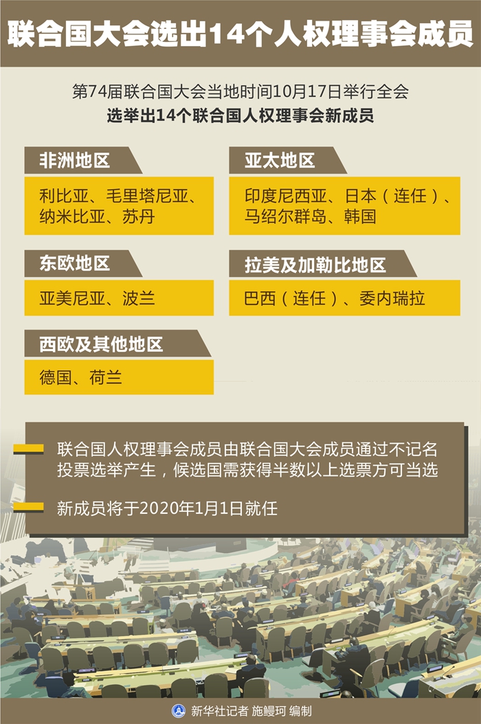 新華社聯(lián)合國10月17日電(記者尚緒謙)第74屆聯(lián)合國大會17日舉行全會,選舉出14個聯(lián)合國人權理事會新成員,以接替將于今年年底結(jié)束任期的成員。新成員將于2020年1月1日就任。