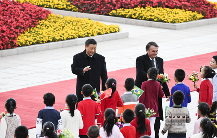 圖為2019年10月25日,習(xí)近平在人民大會(huì)堂東門外廣場(chǎng)為到訪的巴西總統(tǒng)博索納羅舉行歡迎儀式。在巴西出席金磚國(guó)家領(lǐng)導(dǎo)人會(huì)晤期間,習(xí)主席還將同博索納羅總統(tǒng)舉行會(huì)談。這將是一個(gè)月內(nèi)兩國(guó)元首再次互動(dòng)。新華社記者高潔攝