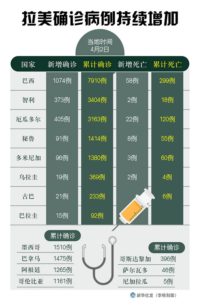 新華社圣保羅4月2日電 綜合新華社駐拉美地區(qū)記者報道:拉美各國衛(wèi)生部門2日發(fā)布的新冠疫情最新數(shù)據(jù)顯示,拉美地區(qū)確診病例持續(xù)增加。多國采取了隔離、停課、宵禁等措施應(yīng)對疫情。
