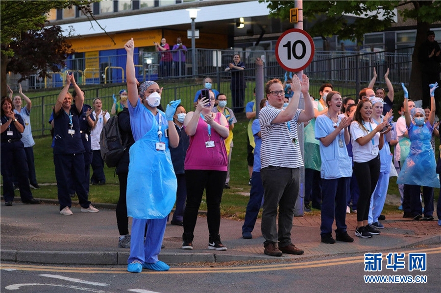 4月23日,在英國雷丁,皇家伯克郡醫(yī)院的醫(yī)護(hù)人員在醫(yī)院外鼓掌。新冠疫情暴發(fā)以來,每周四晚八時,英國人在陽臺、門前或窗前鼓掌,向醫(yī)護(hù)人員致敬。部分醫(yī)院的醫(yī)護(hù)人員也忙里偷閑走出醫(yī)院,感謝人們的支持,也為自己鼓掌加油。新華社發(fā)(蒂姆·愛爾蘭攝)