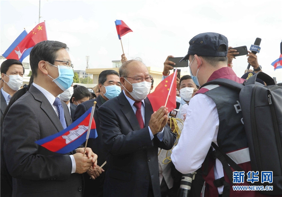 3月23日,在柬埔寨首都金邊,柬埔寨衛(wèi)生大臣曼本亨(中)在機(jī)場迎接中國抗疫醫(yī)療專家組。新華社記者 毛鵬飛 攝