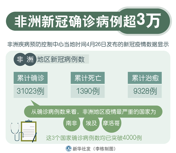 新華社達(dá)累斯薩拉姆4月26日電 綜合新華社駐非洲地區(qū)記者報(bào)道:非洲疾病預(yù)防控制中心26日發(fā)布的新冠疫情數(shù)據(jù)顯示,非洲地區(qū)新冠累計(jì)確診病例數(shù)為31023例,累計(jì)死亡1390例,累計(jì)治愈9328例。為支持非洲各國抗擊新冠疫情,聯(lián)合國推出信息平臺(tái)協(xié)助抗疫。