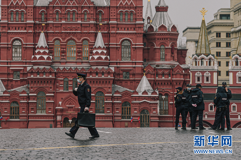 5月4日,一名警察(左)經(jīng)過俄羅斯莫斯科紅場。 為遏制新冠疫情蔓延,3月30日起莫斯科和俄多城實(shí)施居家隔離制度。 新華社發(fā)(葉甫蓋尼·西尼岑攝)
